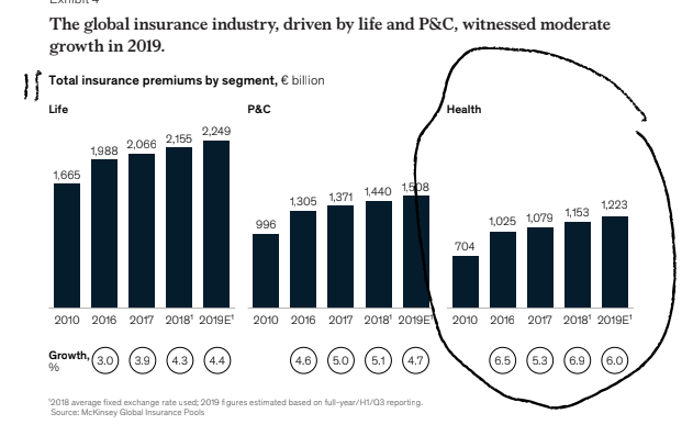 Health insurance continued to be the fastest-growing segment: it achieved 6.9 and 5.9 percent growth in 2018 and 2019.