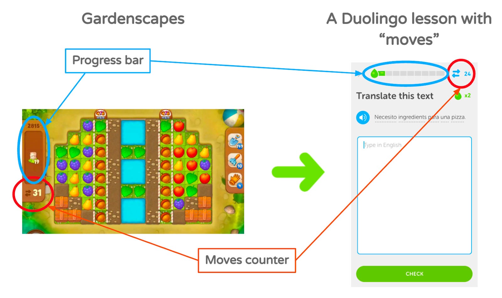 Gardenscapes, however, paired its progress bar with a moves counter, which Duolingo didnât do. The moves counter allowed users only a finite number of moves to complete a level, which added a sense of scarcity and urgency to the gameplay. We decided to incorporate the counter mechanic into our product. We gave our users a finite number of chances to answer questions correctly before they had to start the lesson over.